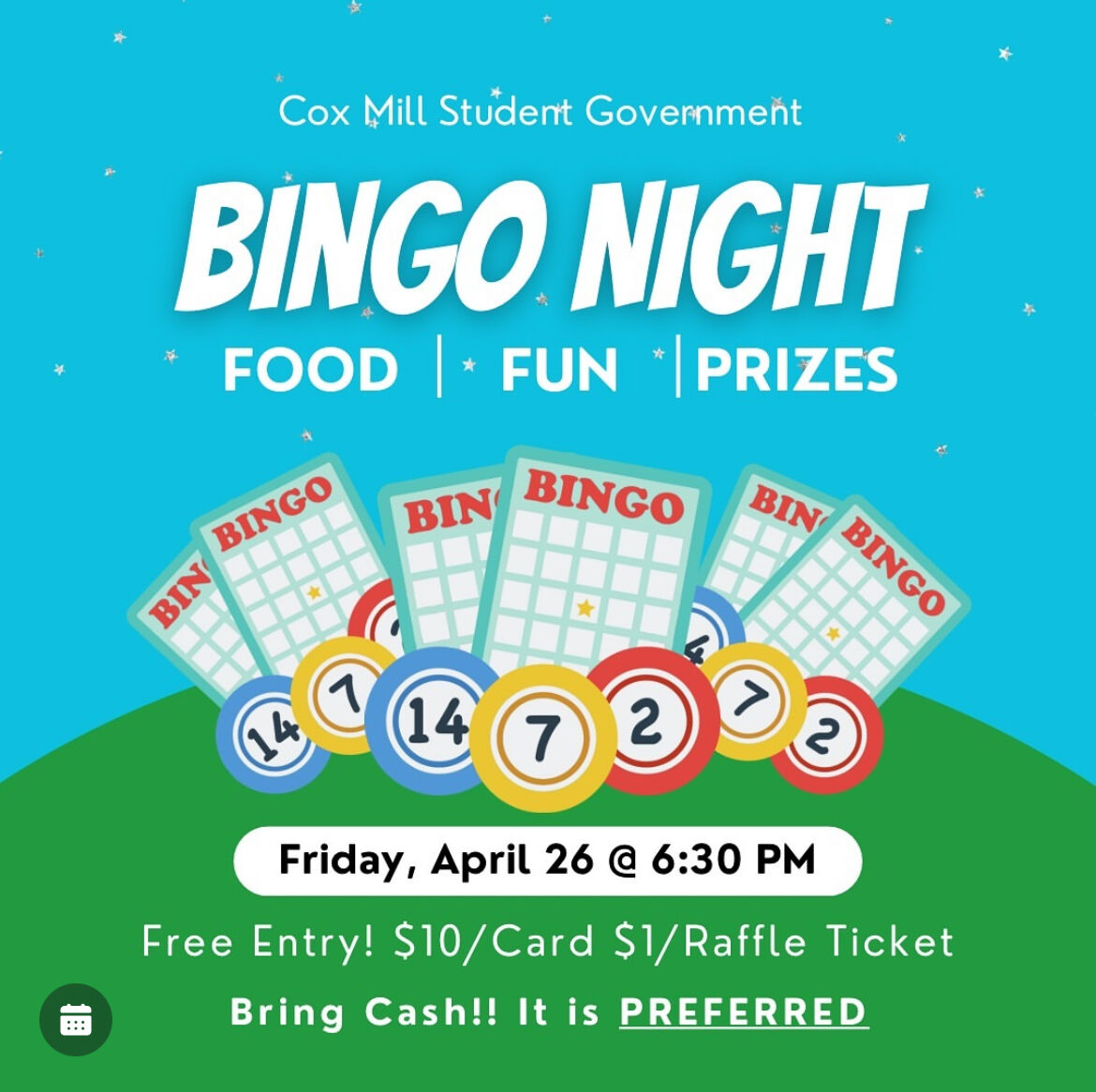 Please join us this Friday, April 26th at 6:30pm for Cox Mill's second annual Bingo Night! The majority of the proceeds will be going to the Children's Tumor Foundation to fund research to "End NF". Please come out to show your support! 💙💚 ***cash is preferred***